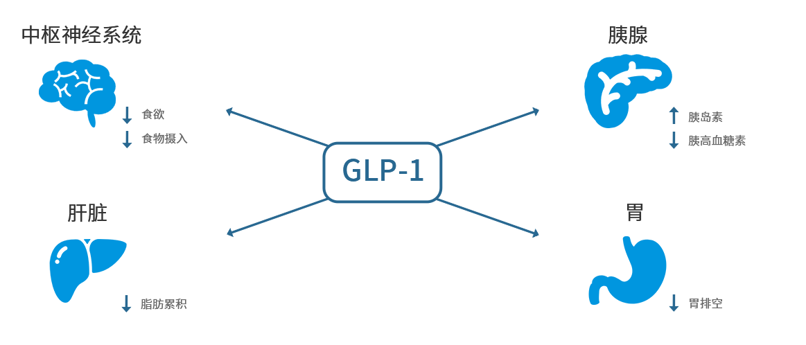 用GLP-1受體激動劑治療2型糖尿病患者可以使其胰島素分泌增加、胰島素抵抗降低、血糖降低以及體重減輕。